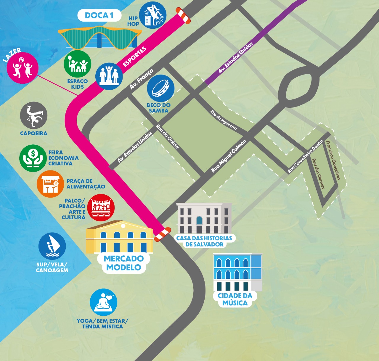 A 1ª edição do Programa Viver Salvador vai aquecer o bairro do Comércio neste domingo (17), quando o trecho entre o Doca 1 e o Mercado Modelo será fechado para atividades culturais, recebendo espaço kids, apresentações de samba, hip hop, capoeira, feira de economia criativa, stand up paddle, vela e canoagem. A iniciativa é realizada pela Prefeitura de Salvador, através da Secretaria de Cultura e Turismo (Secult).