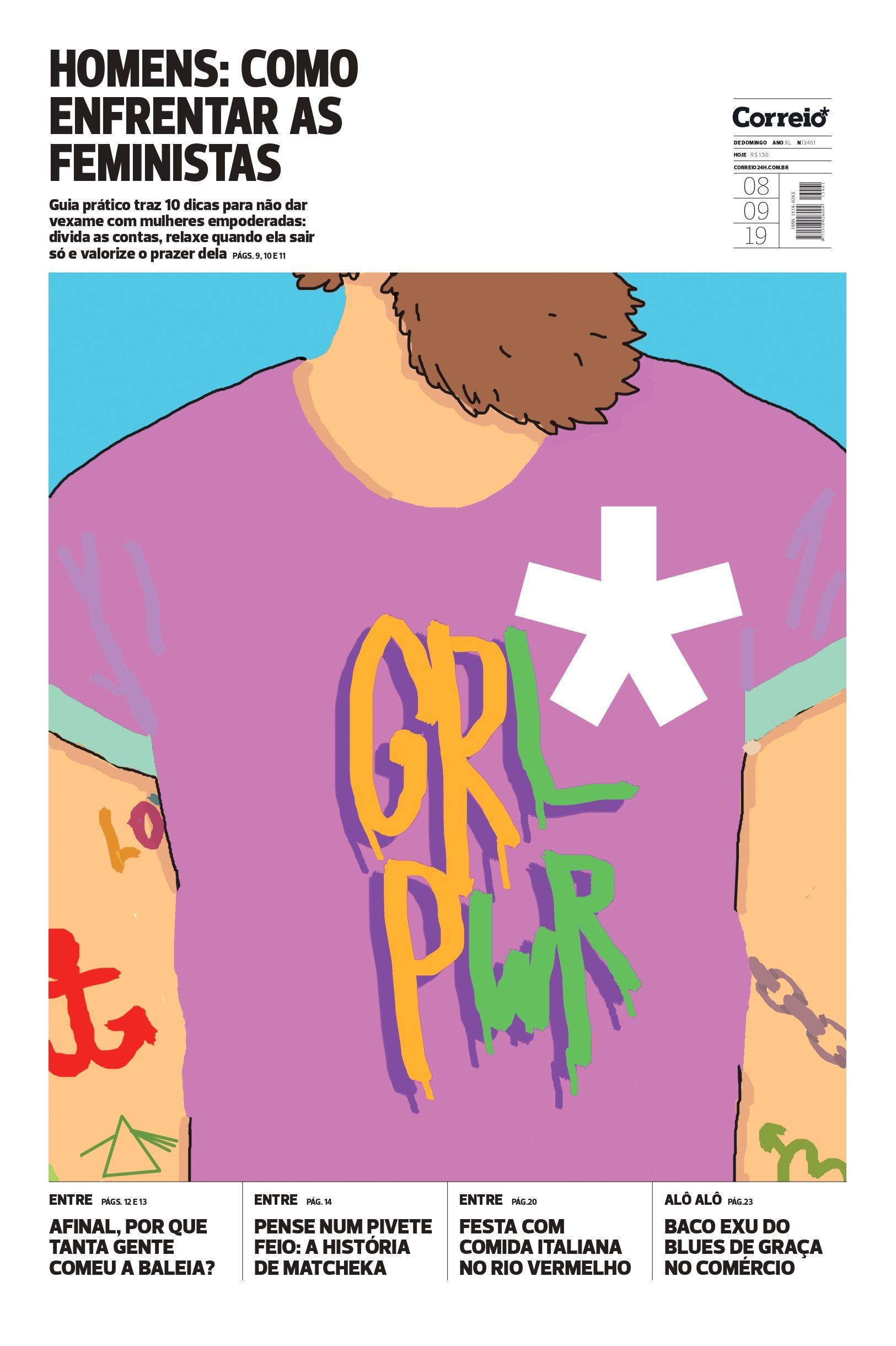 A capa do jornal Correio* deste domingo (8) deu o que falar na web. Isso porque a manchete traz o seguinte título: “Homens: Como enfrentar feministas”. Além do título, a capa traz o desenho de um homem vestindo uma camisa com os dizeres “Girl Power”. Apesar de explicar que o verbo “enfrentar” apresenta-se no contexto como  “estar ou colocar(-se) defronte a, defrontar”, os internautas não perdoaram e o jornal, que recebeu uma enxurrada de críticas.