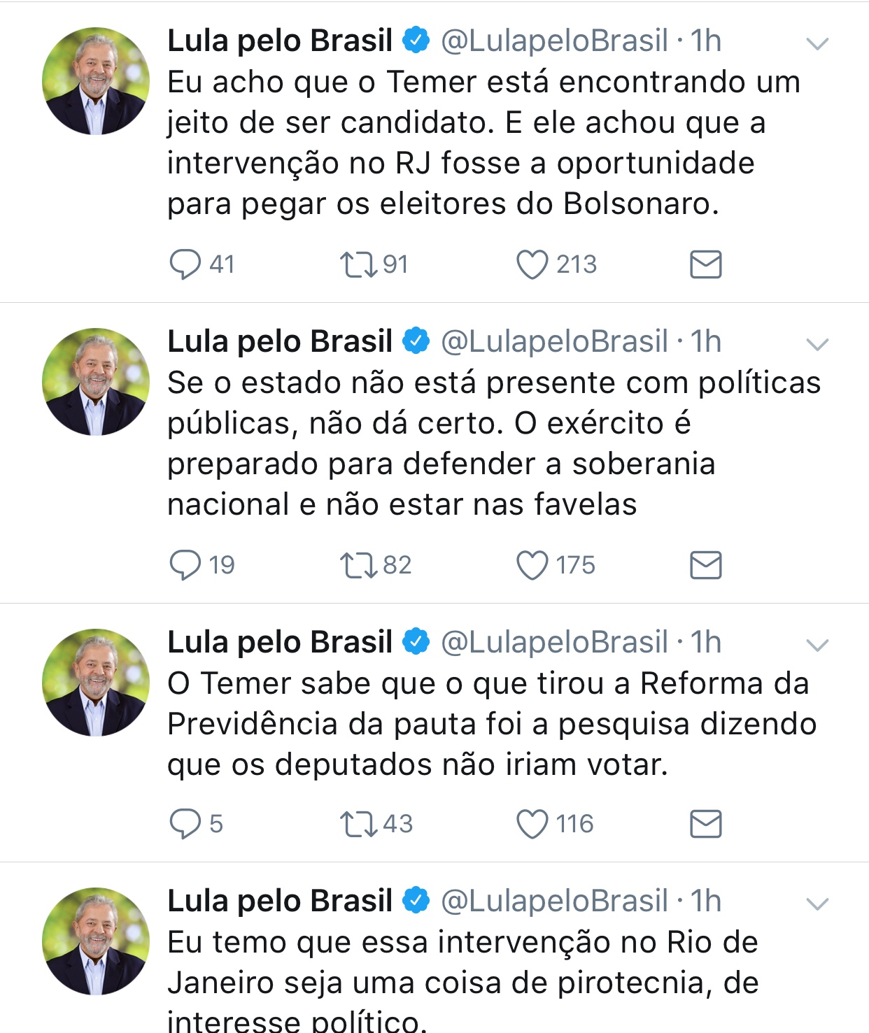 O ex-presidente Luiz Inácio Lula da Silva se manifestou nesta quarta-feira (21) nas redes sociais sobre a intervenção federal no Rio de Janeiro. Ele escreveu em seu perfil no microblog Twitter que teme que a medida tenha interesses políticos.