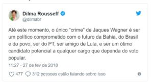 Em defesa do petista, Dilma também publicou: “Até este momento, o único “crime” de Jaques Wagner é ser um político comprometido com o futuro da Bahia, do Brasil e do povo, ser do PT, ser amigo de Lula, e ser um ótimo candidato potencial a qualquer cargo que dependa do voto popular”.