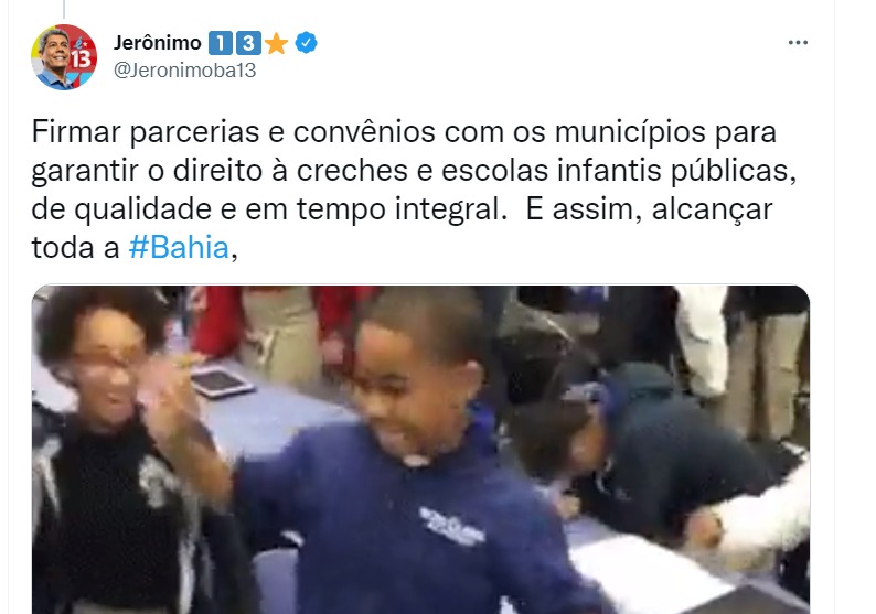 Uma das pedras no calcanhar do candidato petista ao governo, Jerônimo Rodrigues, são as últimas colocações do ensino estadual baiano nos rankings nacionais, notadamente o Ideb. Na última quinta-feira (25), justamente ao tuitar sobre educação, o ex-secretário da Educação (ou quem administra a conta) aplicou uma crase inexistente: “Firmar parcerias e convênios com os municípios para garantir o direito à creches (sic) e escolas infantis públicas, de qualidade e em tempo integral”. Tem que ficar atento à campanha e ao vernáculo.
