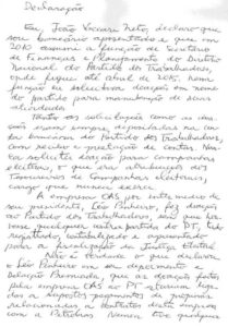 “Não é verdade o que declarou o Léo Pinheiro em seu depoimento e delação premiada, que as doações feitas pela empresa OAS ao PT estariam ligadas a supostos pagamentos de propinas relacionadas a contratos desta empresa com a Petrobrás”, diz o documento.