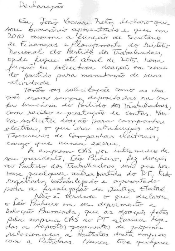 O ex-tesoureiro do PT João Vaccari Neto, escreveu uma carta, enviada pela defesa do ex-presidente Lula ao TRF-4, dizendo que não intermediou o recebimento do triplex do Guarujá para o petista. Preso desde abril de 2015, o ex-tesoureiro desmentiu o depoimento do delator Léo Pinheiro.