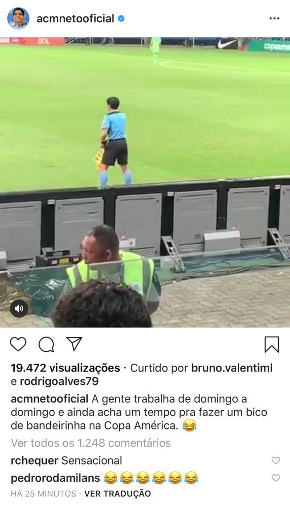 O prefeito ACM Neto publicou no Instagram um vídeo em que aparece atuando como bandeirinha do jogo Brasil e Venezuela, disputado ontem na Arena Fonte Nova. É claro que se tratava de um “sósia” do prefeito, mas a semelhança física chamou atenção e viraliza nas redes.