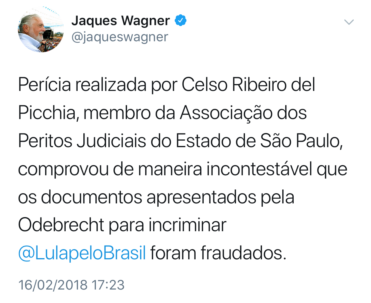 No Twitter, o ex-governador Jaques Wagner (PT) diz que a Odebrecht forjou provas contra Lula. “Perícia realizada por Celso Ribeiro del Picchia, membro da Associação dos Peritos Judiciais do Estado de São Paulo, comprovou de maneira incontestável que os documentos apresentados pela Odebrecht para incriminar ‪@LulapeloBrasil‬ foram fraudados.”, tuitou Wagner. O perito foi contratado pelo PT.